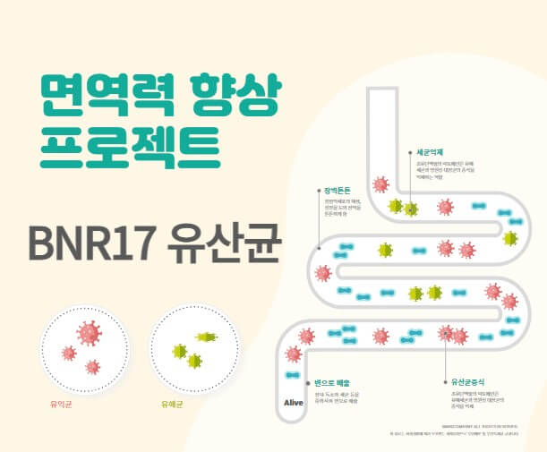 - bnr17 유산균이 장에서 활동하면 면역세포의 활성화를 촉진하게 됩니다. 여기에서 각 종 세포를 활성화시켜 면역 반응을 강화하게 하는데 약해진 면역력을 높여 면역 체계의 균형을 이룰 수 있도록 도와줍니다. 또한 장에서 생기는 염증을 bnr17 유산균이 억제하여 염증으로 인해 떨어지는 면역력을 향상할 수 있습니다.